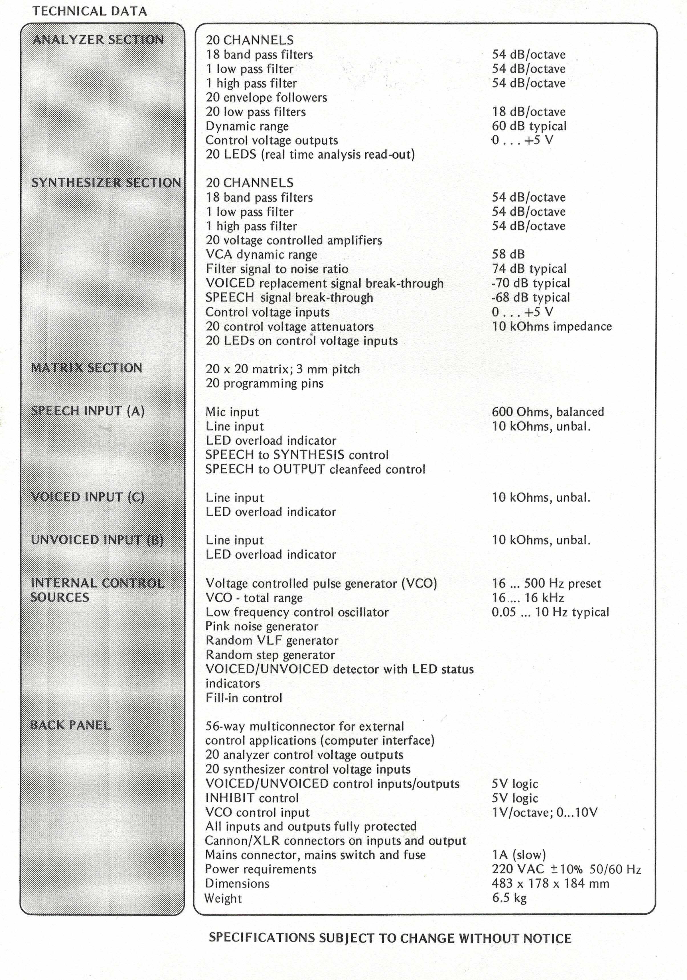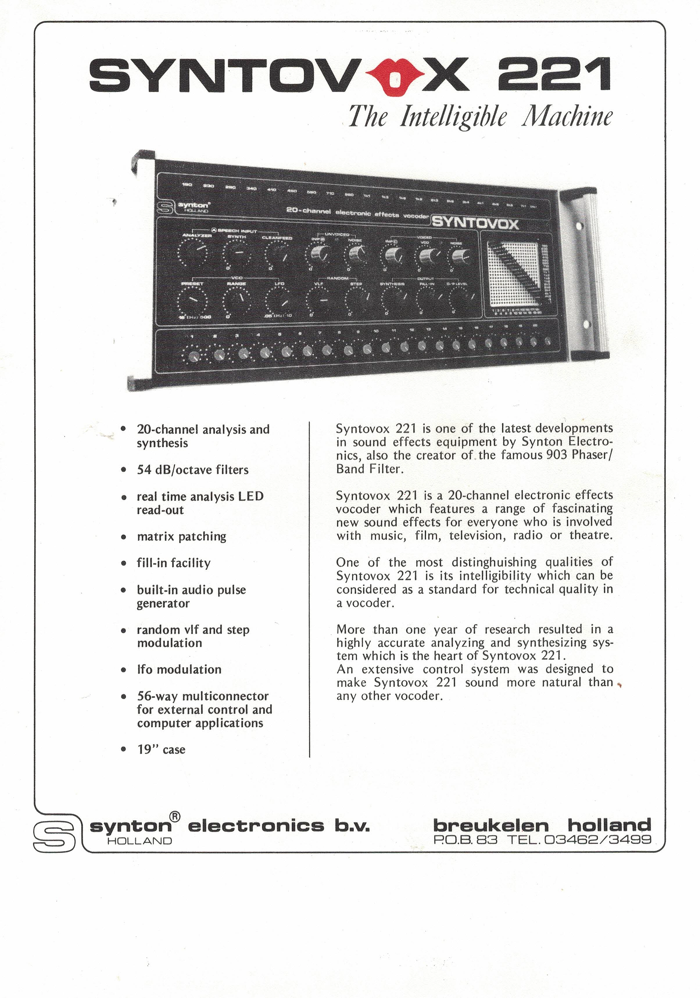 The 1220 vocoder expander unit pictured above this 221 is a one-off piece Synton built for Dutch broadcasting company NOS. It houses a pitch to voltage converter, CV freeze function and a ‘presto-patch’ edge connector for making analyzer-synthesizer patches